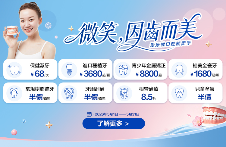即日起至2026年4月30日,預約到愛康健補牙可享常規樹脂補牙首顆半價,第二顆起7.5折的活動。